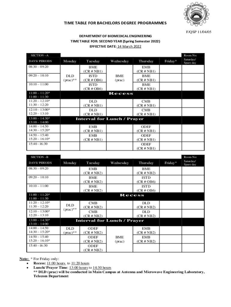 TIME TABLE FOR BACHELORS DEGREE PROGRAMMES F/QSP 11/04/05 DEPARTMENT OF BIOMEDICAL ENGINEERING TIME TABLE FOR: SECOND YEAR (Spring Semester 2022) EFFECTIVE DATE: 14 March 2022 SECTION A DAYS/ PERIODSMondayTuesdayDLD