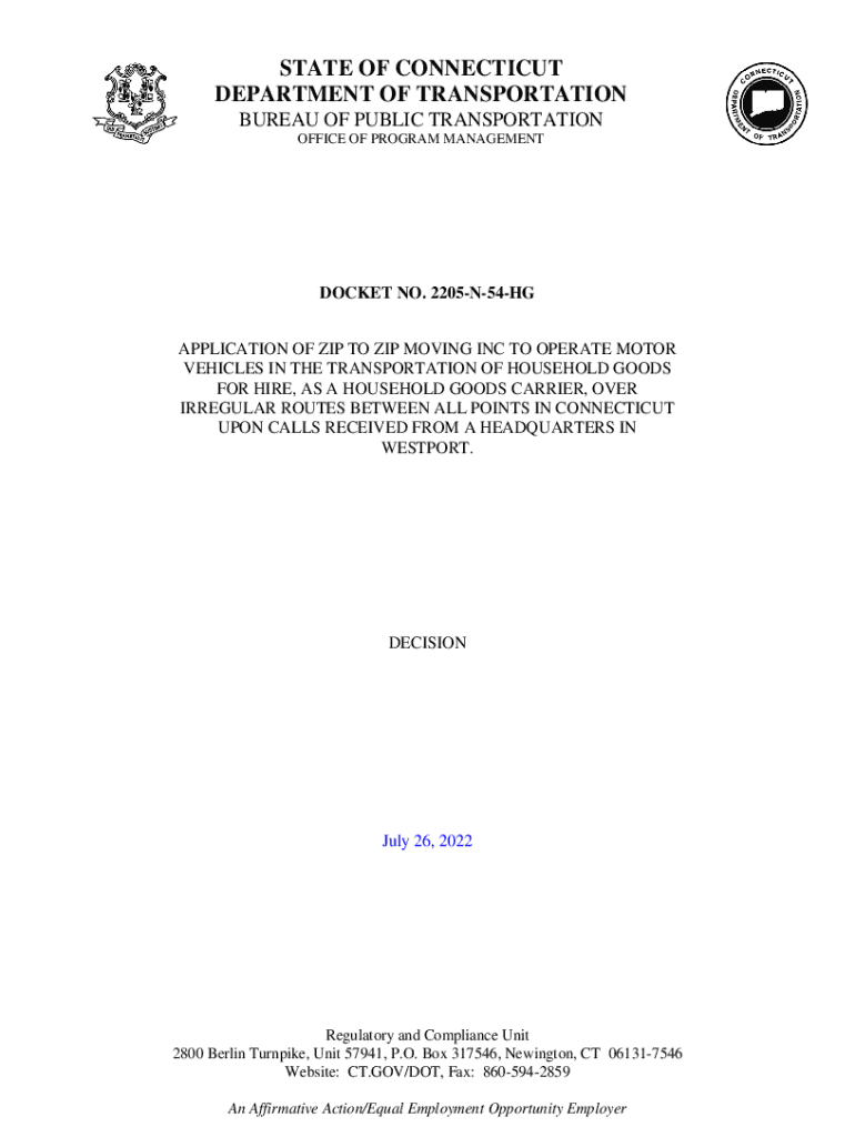 STATE OF CONNECTICUT DEPARTMENT OF TRANSPORTATION BUREAU OF PUBLIC TRANSPORTATION OFFICE OF PROGRAM MANAGEMENTDOCKET NO. 2205N54HG APPLICATION OF ZIP TO ZIP MOVING INC TO OPERATE MOTOR VEHICLES IN