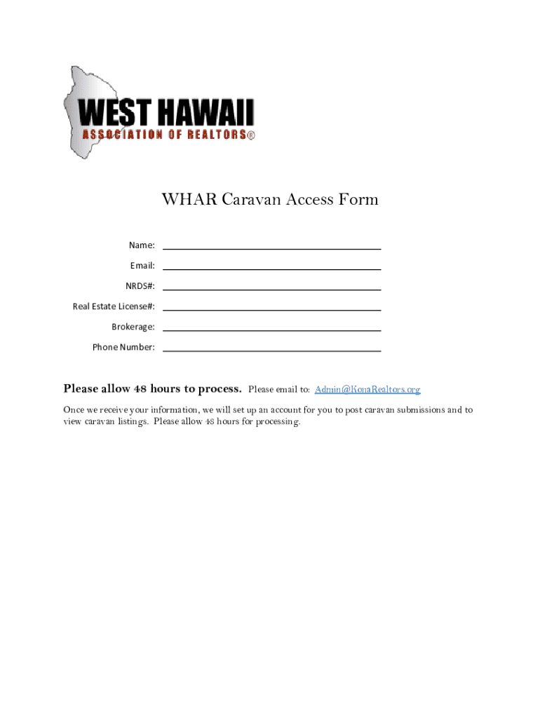 WHAT Caravan Access Form Name: Email: RDS#: Real Estate License#: Brokerage: Phone Number:Please allow 48 hours to process. Please email to: Admin@KonaRealtors.orgOnce we receive your information,