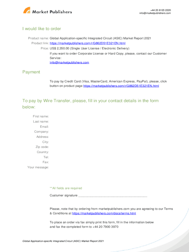 +44 20 8123 2220 info@marketpublishers.comGlobal Application specific Integrated Circuit (ASIC) Market Report 2021 https://marketpublishers.com/r/G862D51E321EN.html Date: June 2021 Pages: 119 Price:
