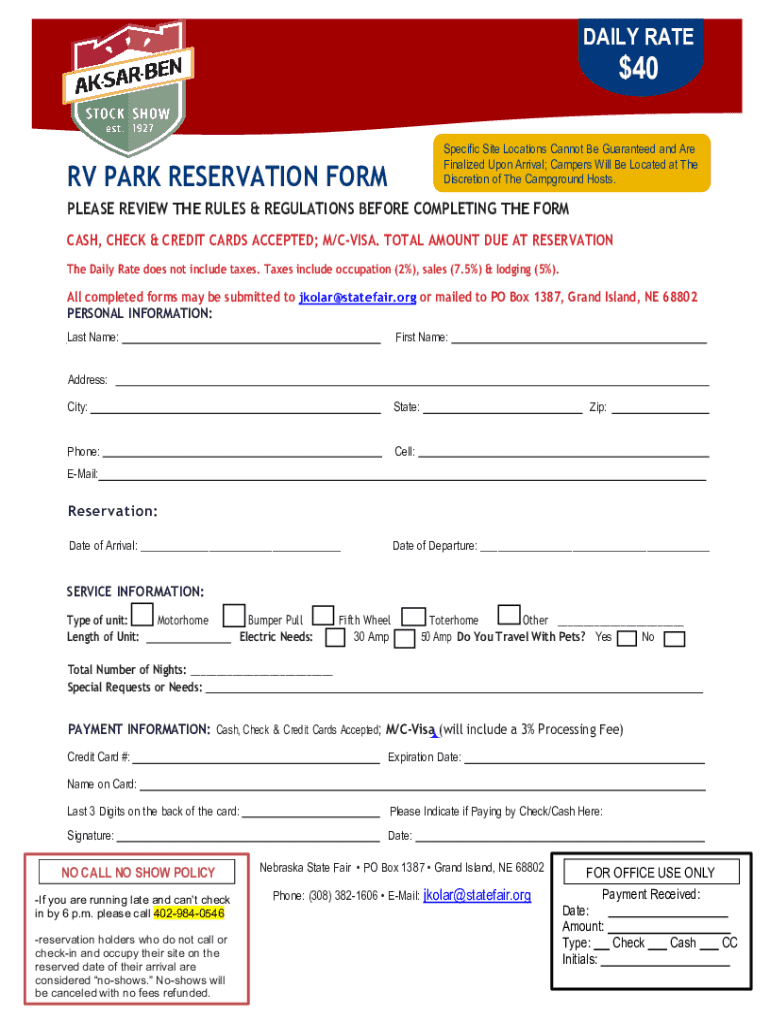DAILY RATE$40Specific Site Locations Cannot Be Guaranteed and Are Finalized Upon Arrival; Campers Will Be Located at The Discretion of The Campground Hosts. RV PARK RESERVATION FORMULAS REVIEW THE