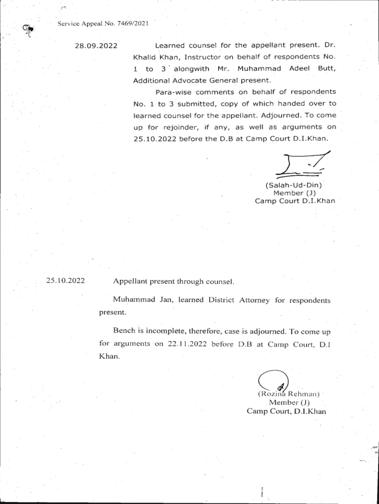 ..iTuService Appeal No. 7469/2021Learned counsel for the appellant present. Dr.28.09.2022Khalid Khan, Instructor on behalf of respondents No. 1to3alongwithMr.MuhammadAdeelButt,Additional Advocate