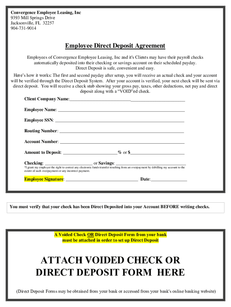 Convergence Employee Leasing, Inc 9393 Mill Springs Drive Jacksonville, FL 32257 9047319014Employee Direct Deposit Agreement Employees of Convergence Employee Leasing, Inc and it\'s Clients may have