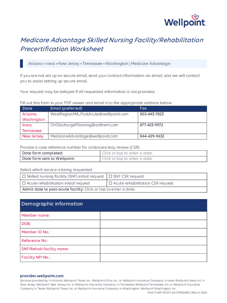 Medicare Advantage Skilled Nursing Facility/Rehabilitation Precertification Worksheet Arizona Iowa New Jersey Tennessee Washington | Medicare Advantage If you are not set up on secure email, send