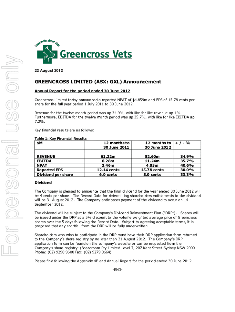 For personal use only22 August 2012GREENCROSS LIMITED (ASX: GXL) Announcement Annual Report for the period ended 30 June 2012 Greencross Limited today announced a reported NPAT of $4.859m and EPS