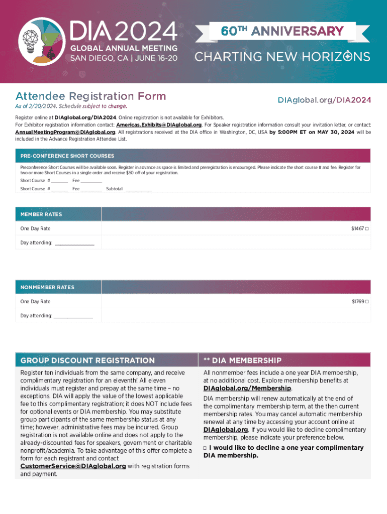 Attendee Registration Form As of 2/20/2024. Schedule subject to change.DIAglobal.org/DIA2024Register online at DIAglobal.org/DIA2024. Online registration is not available for Exhibitors. For Exhibitor