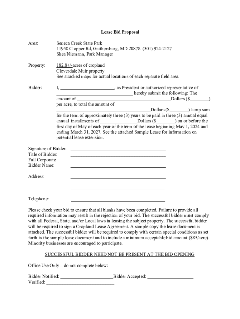 Lease Bid Proposal Area:Seneca Creek State Park 11950 Copper Rd, Gaithersburg, MD 20878. (301) 9242127 Shea Riemann, Park ManagerProperty:182.8+/acres of cropland Clover dale Muir property See attached