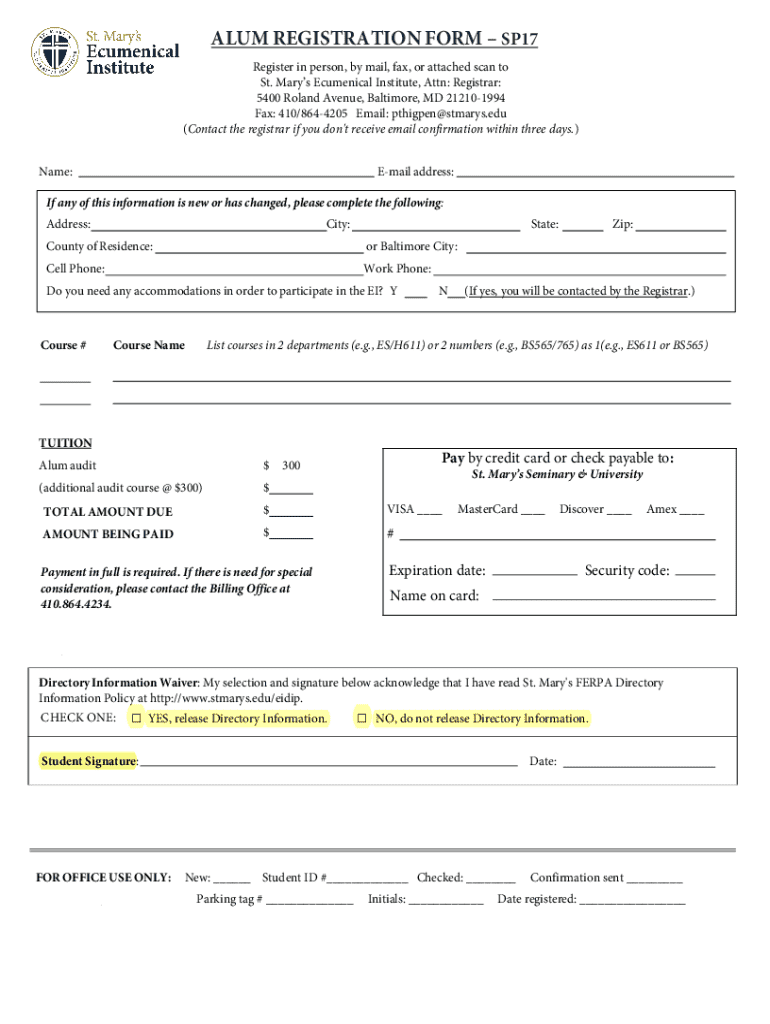 ALUM REGISTRATION FORM SP17 Register in person, by mail, fax, or attached scan to St. Marys Ecumenical Institute, Attn: Registrar: 5400 Roland Avenue, Baltimore, MD 212101994 Fax: 410/8644205 Email: