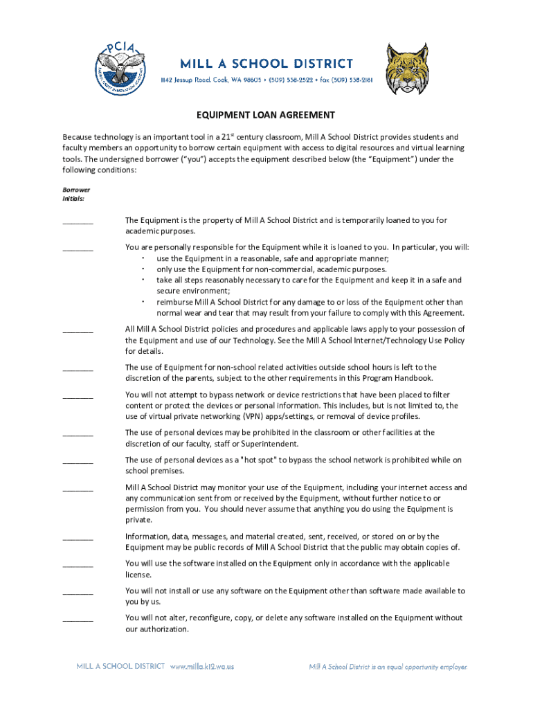 EQUIPMENT LOAN AGREEMENT Because technology is an important tool in a 21st century classroom, Mill A School District provides students and faculty members an opportunity to borrow certain equipment