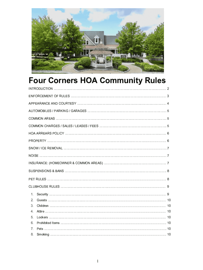 Four Corners HOA Community Rules INTRODUCTION ...... 2 ENFORCEMENT OF RULES ....................... 3 APPEARANCE AND COURTESY ............ 4 AUTOMOBILES / PARKING / GARAGES .... 5 COMMON