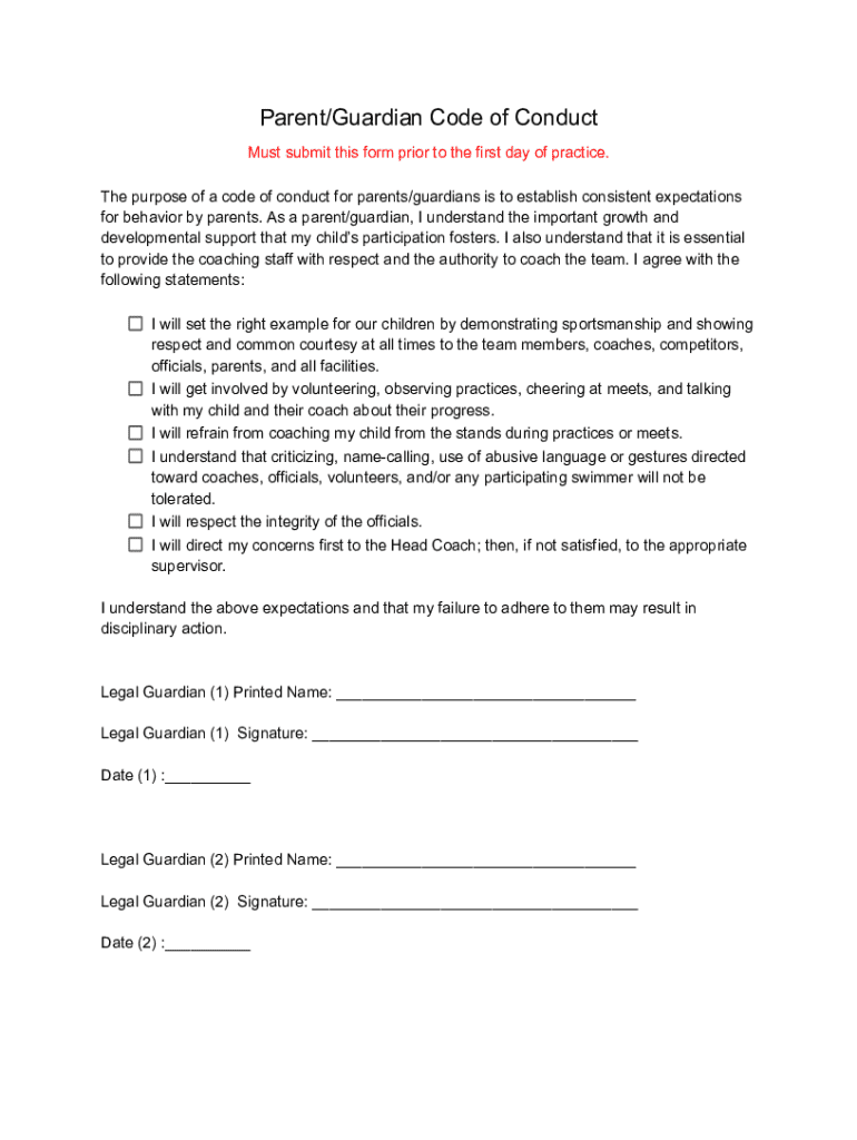 Parent/Guardian Code of Conduct Must submit this form prior to the first day of practice. The purpose of a code of conduct for parents/guardians is to establish consistent expectations for behavior