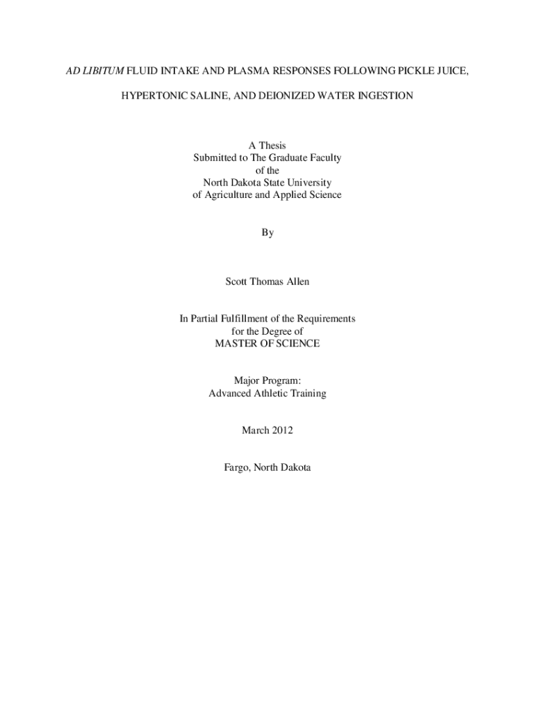 AD LIBITUM FLUID INTAKE AND PLASMA RESPONSES FOLLOWING PICKLE JUICE, HYPERTONIC SALINE, AND DEIONIZED WATER INGESTIONA Thesis Submitted to The Graduate Faculty of the North Dakota State University