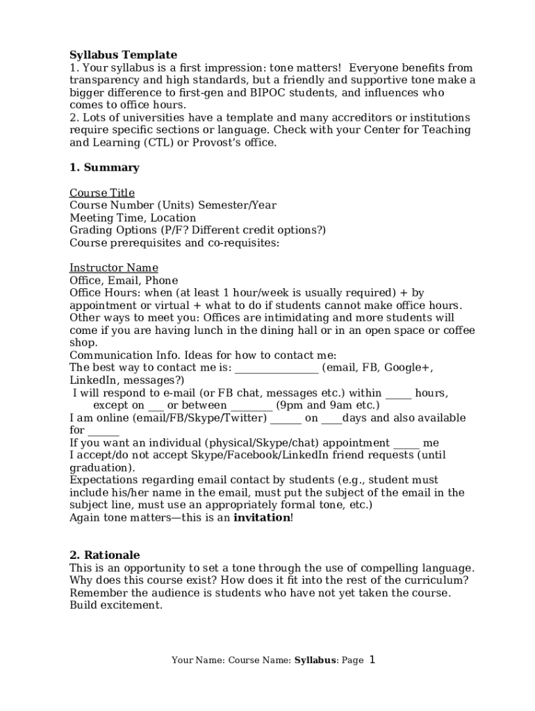 The Syllabus Language Sets the Tone for Your Course is a document that can be completed and signed for specific reasons. Then, it is provided to the relevant addressee to provide some information and data. The completion and signing is possible manually or via a suitable tool like PDFfiller. These applications help to submit any PDF or Word file without printing out. It also allows you to customize its appearance depending on your needs and put an official legal e-signature. Upon finishing, the user sends the Syllabus Language Sets the Tone for Your Course to the respective recipient or several ones by email or fax. PDFfiller provides a feature and options that make your blank printable. It includes various settings when printing out. It doesn't matter how you will deliver a form - physically or by email - it will always look neat and organized. In order not to create a new editable template from the beginning over and over, make the original form as a template. Later, you will have an editable sample.