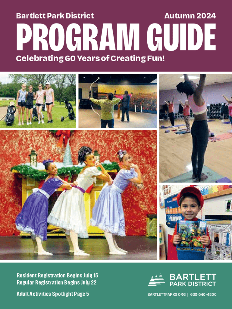 PROGRAM GUIDE Bartlett Park DistrictAutumn 2024Celebrating 60 Years of Creating Fun!Resident Registration Begins July 15 Regular Registration Begins July 22 Adult Activities Spotlight Page 5BARTLETTPARKS.ORG