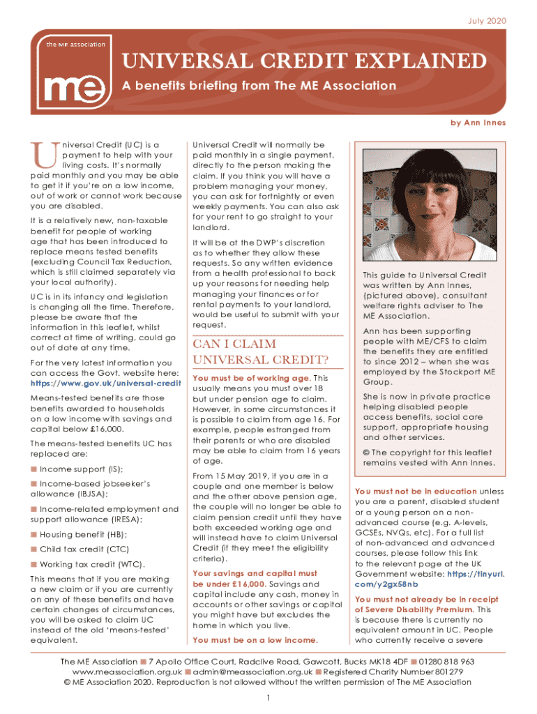 July 2020UNIVERSAL CREDIT EXPLAINED A benefits briefing from The ME Association by Ann InnesUniversal Credit (UC) is a payment to help with your living costs. Its normally paid monthly and you may