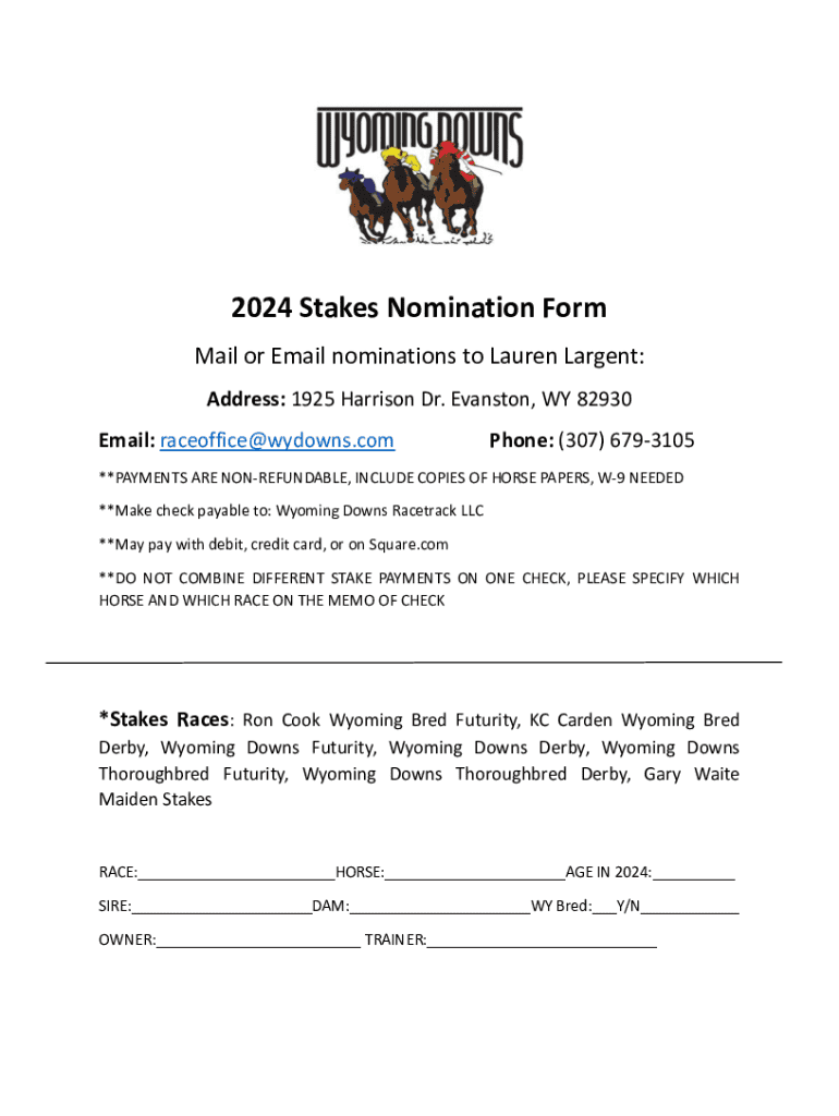 2024 Stakes Nomination Form Mail or Email nominations to Lauren Largest: Address: 1925 Harrison Dr. Evanston, WY 82930 Email: raceoffice@wydowns.comPhone: (307) 6793105**PAYMENTS ARE NONREFUNDABLE,
