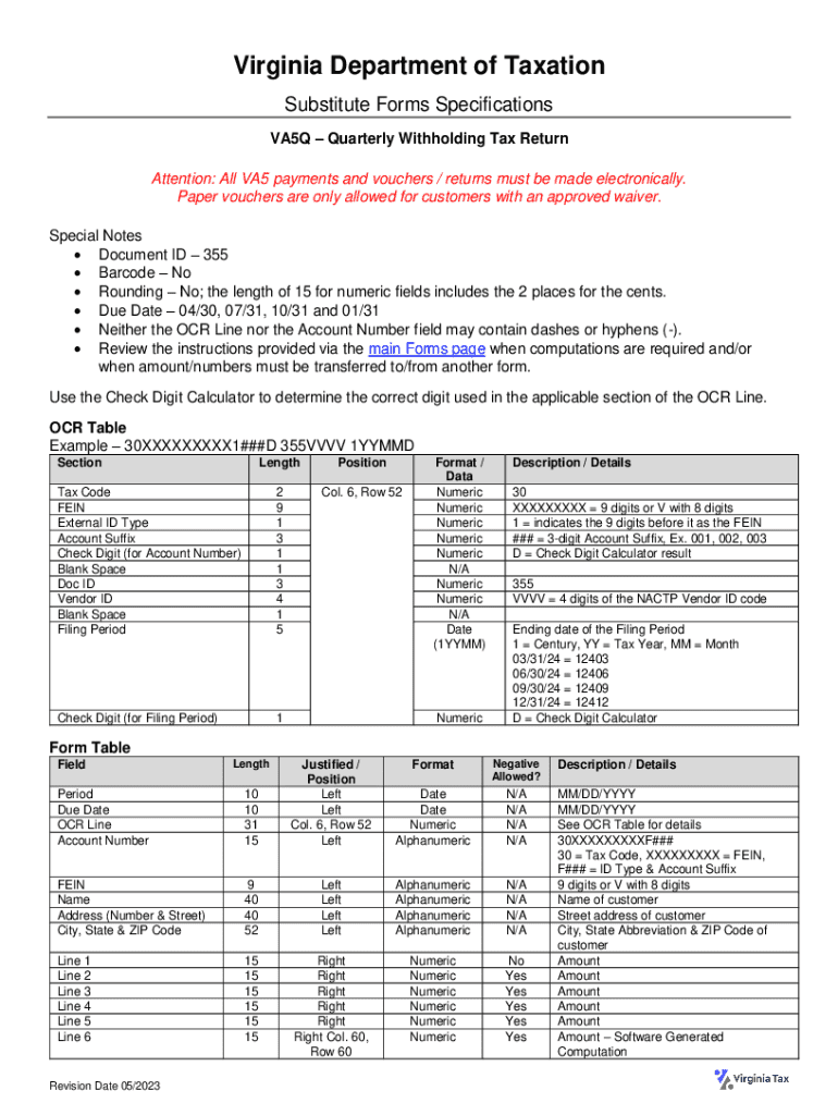Virginia Department of Taxation Substitute Forms Specifications VA5Q Quarterly Withholding Tax Return Attention: All VA5 payments and vouchers / returns must be made electronically. Paper vouchers