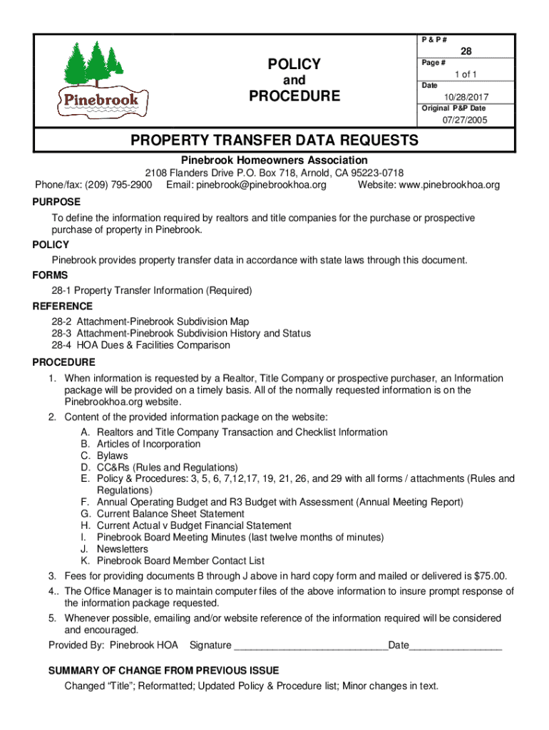 P&P#28POLICY andPage #1 of 1 DatePROCEDURE10/28/2017 Original P&P Date07/27/2005PROPERTY TRANSFER DATA REQUESTS Pinebrook Homeowners Association 2108 Flanders Drive P.O. Box 718, Arnold, CA 952230718