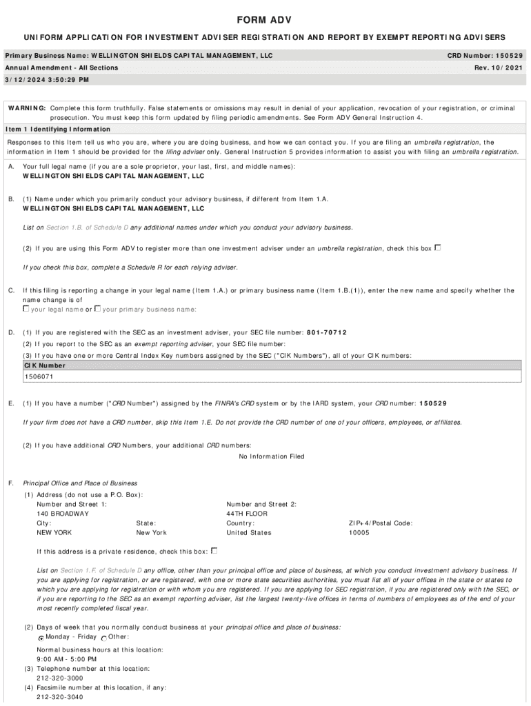 FORM ADV UNIFORM APPLICATION FOR INVESTMENT ADVISER REGISTRATION AND REPORT BY EXEMPT REPORTING ADVISERS Primary Business Name: WELLINGTON SHIELDS CAPITAL MANAGEMENT, LLCCRD Number: 150529Annual Amendment