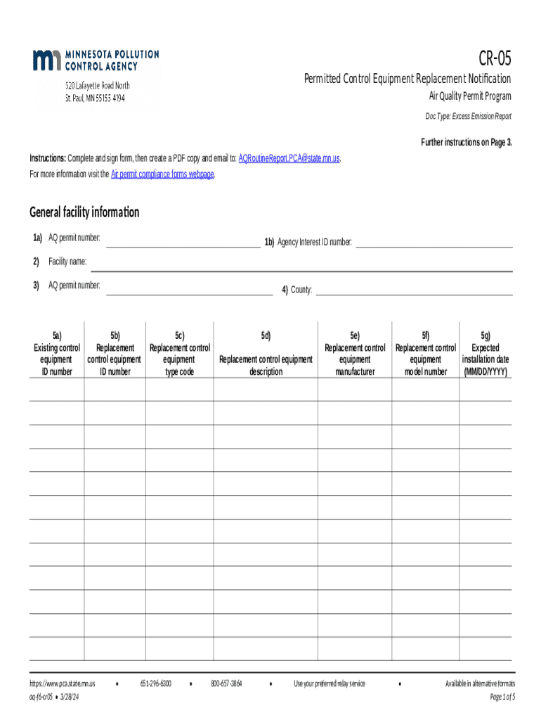 How to fill out CR-05Permitted Control Equipment Replacement Notification -Air Quality Permit Program. used to identify replacement pollution control equipment in permits with specific requirements allowing replacement of TREAs and certify compliance
