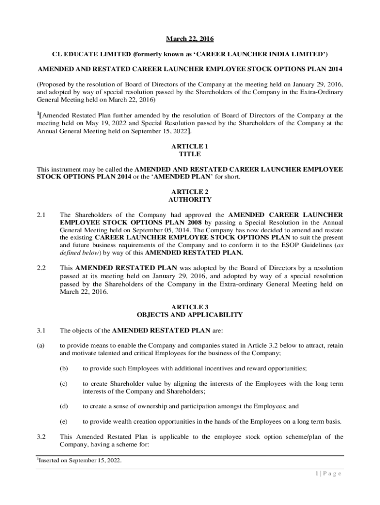 March 22, 2016, CL EDUCATE LIMITED (formerly known as CAREER LAUNCHER INDIA LIMITED) AMENDED AND RESTATED CAREER LAUNCHER EMPLOYEE STOCK OPTIONS PLAN 2014 (Proposed by the resolution of Board of Directors