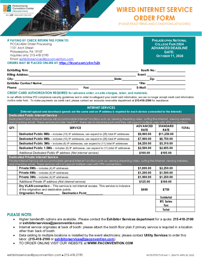 WIRED INTERNET SERVICE ORDER FORM (PLEASE READ TERMS AND CONDITIONS ATTACHED)PHILADELPHIA NATIONAL COLLEGE FAIR 2024 ADVANCED DEADLINE DATE: OCTOBER 11, 2024IF PAYING BY CHECK RETURN THIS FORM TO: