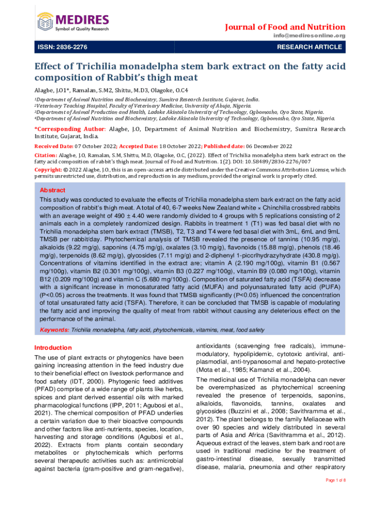 info@mediresonline.orgISSN: 28362276RESEARCH ARTICLEEffect of Trichina monadelpha stem bark extract on the fatty acid