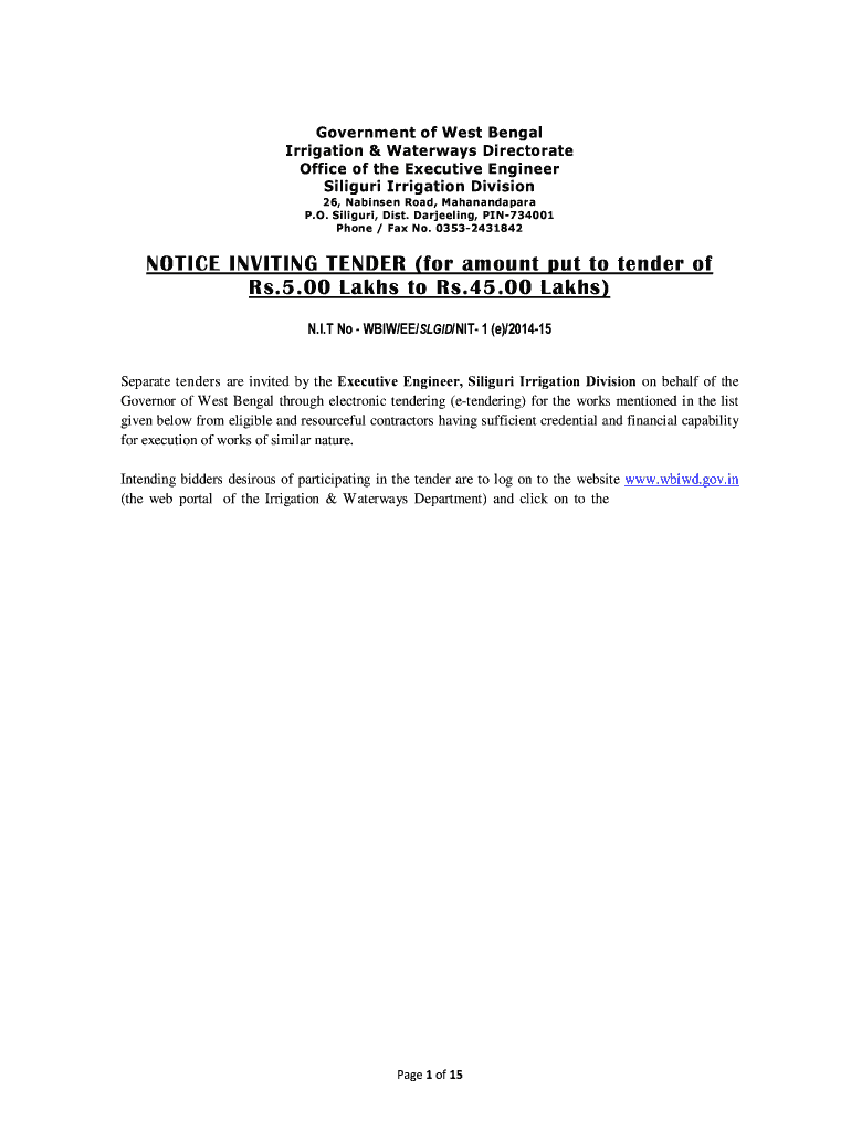 Government of West Bengal Irrigation & Waterways Directorate Office of the Executive Engineer Siliguri Irrigation Division 26, Nansen Road, Mahanandapara P.O. Siliguri, Dist. Darjeeling, PIN734001