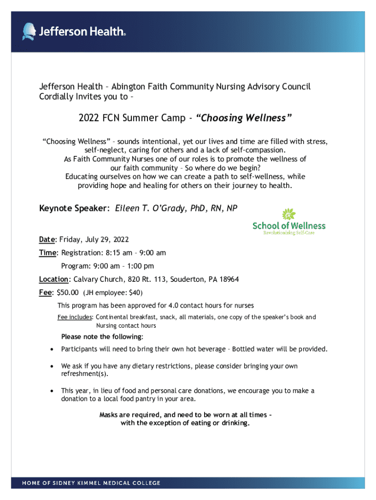 Jefferson Health Abington Faith Community Nursing Advisory Council Cordially Invites you to 2022 FCN Summer Camp Choosing Wellness Choosing Wellness sounds intentional, yet our lives and time are