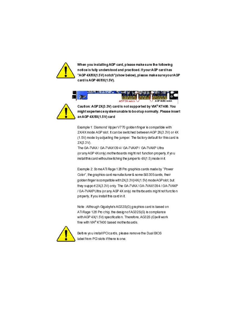 When you installing AGP card, please make sure the following notice is fully understood and practiced. If your AGP card has \"AGP 4X/8X(1.5V) notch\"(show below), please make sure your AGP card is