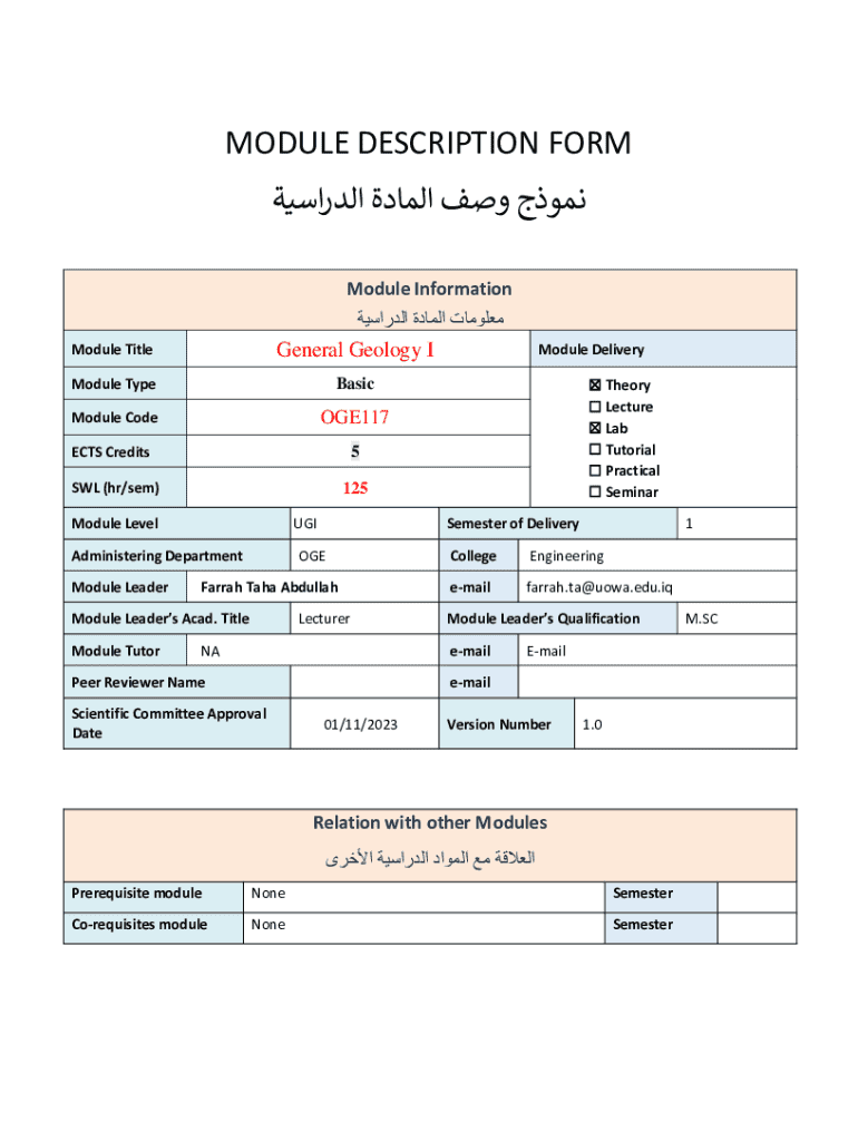 Module TitleGeneral Geology Module TypeBasicModule CodeOGE117ECTS Credits5SWL (hr/SEM)125Module LevelUGx11 Administering Department
