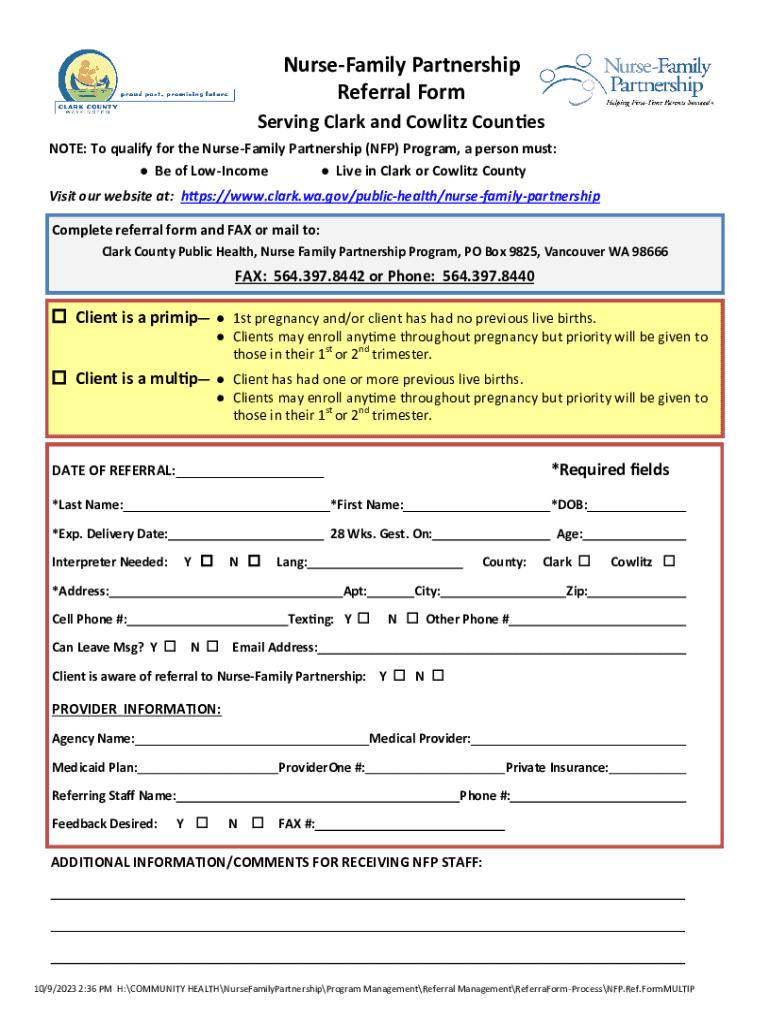 NurseFamily Partnership Referral Form Serving Clark and Cowlitz Counties NOTE: To qualify for the NurseFamily Partnership (NFP) Program, a person must: Be of LowIncome Live in Clark or Cowlitz County