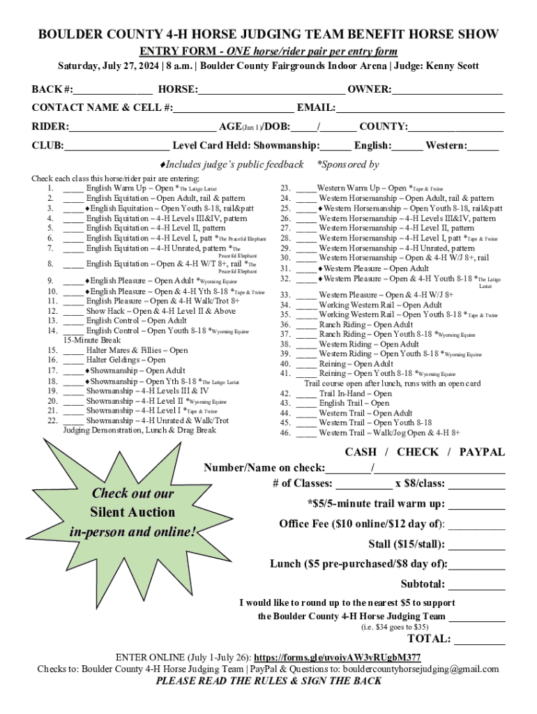 BOULDER COUNTY 4H HORSE JUDGING TEAM BENEFIT HORSE SHOW ENTRY FORM ONE horse/rider pair per entry formSaturday, July 27, 2024 | 8 a.m. | Boulder County Fairgrounds Indoor Arena | Judge: Kenny ScottBACK