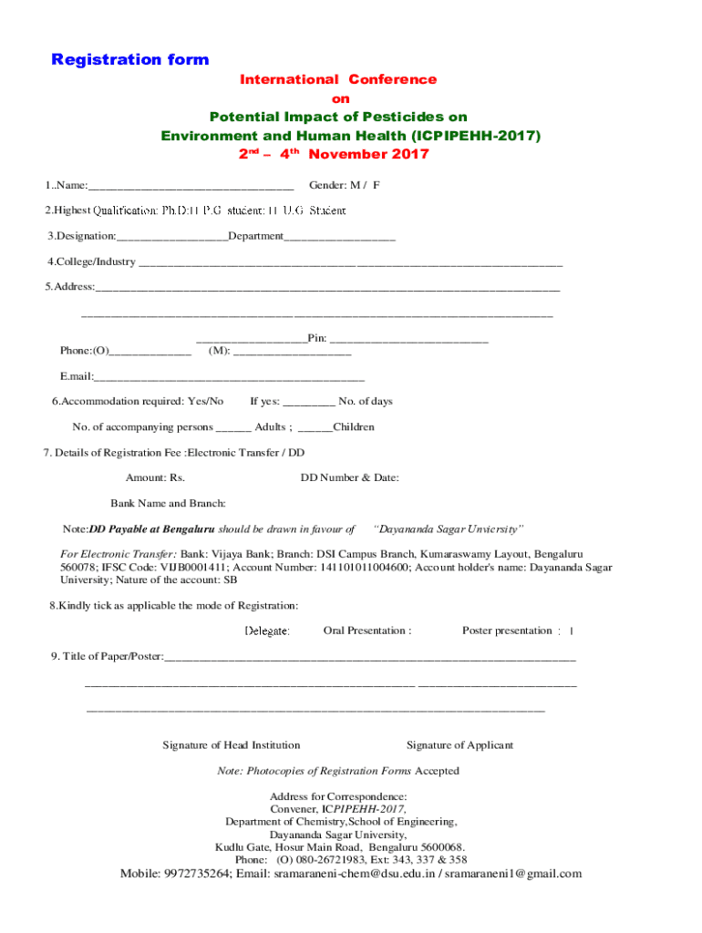 Registration form International Conference on Potential Impact of Pesticides on Environment and Human Health (ICPIPEHH2017) 2nd 4th November 2017 1. Name:___Gender: M / F2. Highest 3. Designation:___Department___