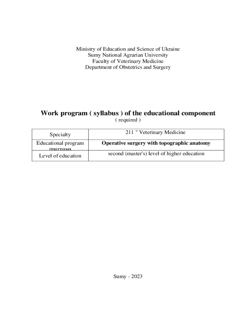 Department of Obstetrics and SurgeryWork program (syllabus) of the educational component