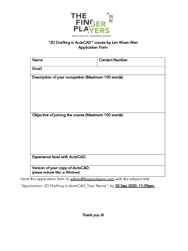 2D Drafting in AutoCAD course by LIM Won Wen Application Form Name:Contact Number:Email: Description of your occupation (Maximum 100 words)Objective of joining the course (Maximum 100 words)Experience
