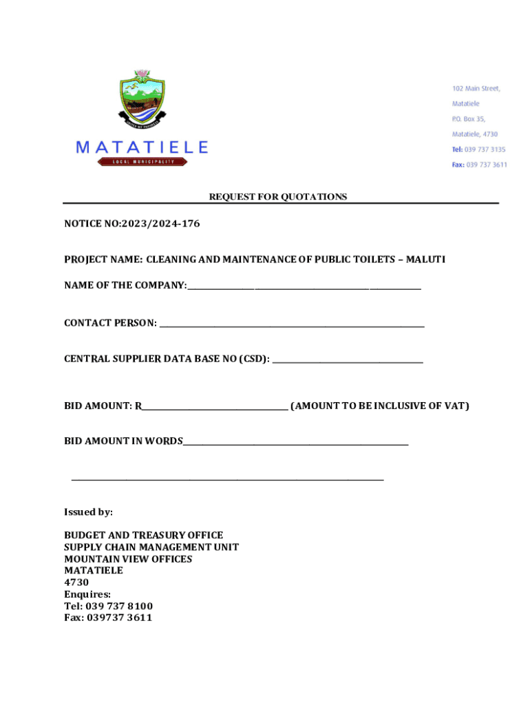 REQUEST FOR QUOTATIONSNOTICE NO:2023/2024176 PROJECT NAME: CLEANING AND MAINTENANCE OF PUBLIC TOILETS MALUTI NAME OF THE COMPANY:___CONTACT PERSON: ___ CENTRAL SUPPLIER DATA BASE NO (CSD): ___BID