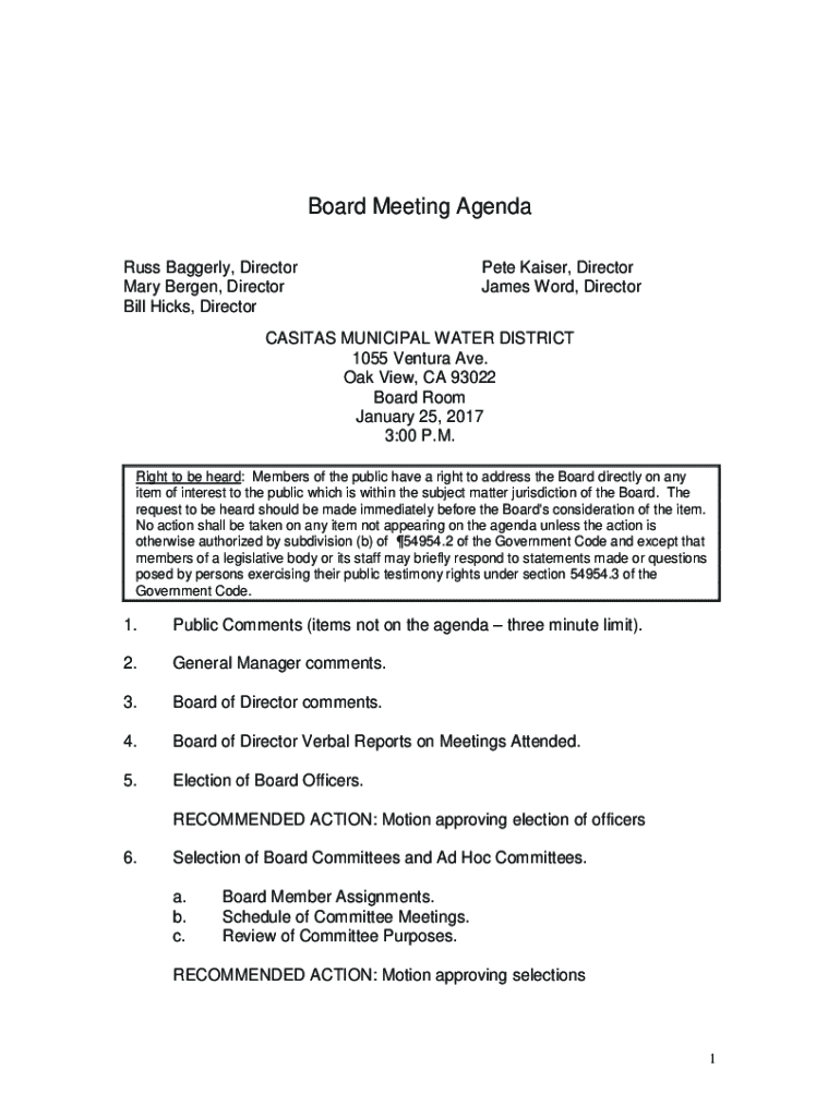 Board Meeting Agenda Russ Baggerly, Director Mary Bergen, Director Bill Hicks, DirectorPete Kaiser, Director James Word, DirectorCASITAS MUNICIPAL WATER DISTRICT 1055 Ventura Ave. Oak View, CA 93022