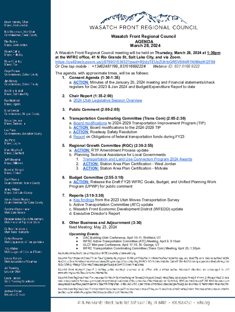 Wasatch Front Regional Council AGENDA March 28, 2024 Wasatch Front Regional Council meeting will be held onThursday, March 28, 2024 at1:30pm A at the WFRC office, 41 N Rio Grande St, Salt Lake City,