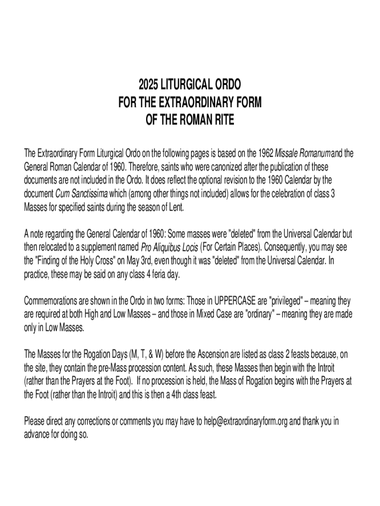 2025 LITURGICAL ORDO FOR THE EXTRAORDINARY FORM OF THE ROMAN RITE The Extraordinary Form Liturgical Ordo on the following pages is based on the 1962 Missale Romanum and the General Roman Calendar