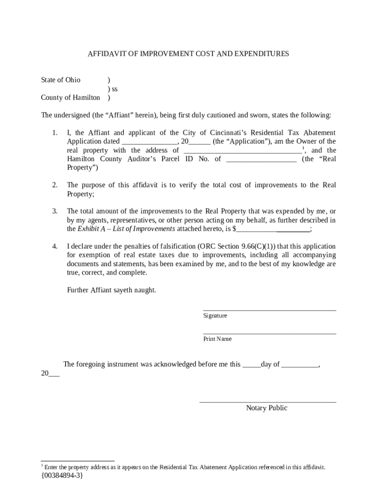 What is Affidavit of Improvement Cost and Expenditures - Residential Tax Abatement (00384894-3).DOC. 00384894-3 Form?