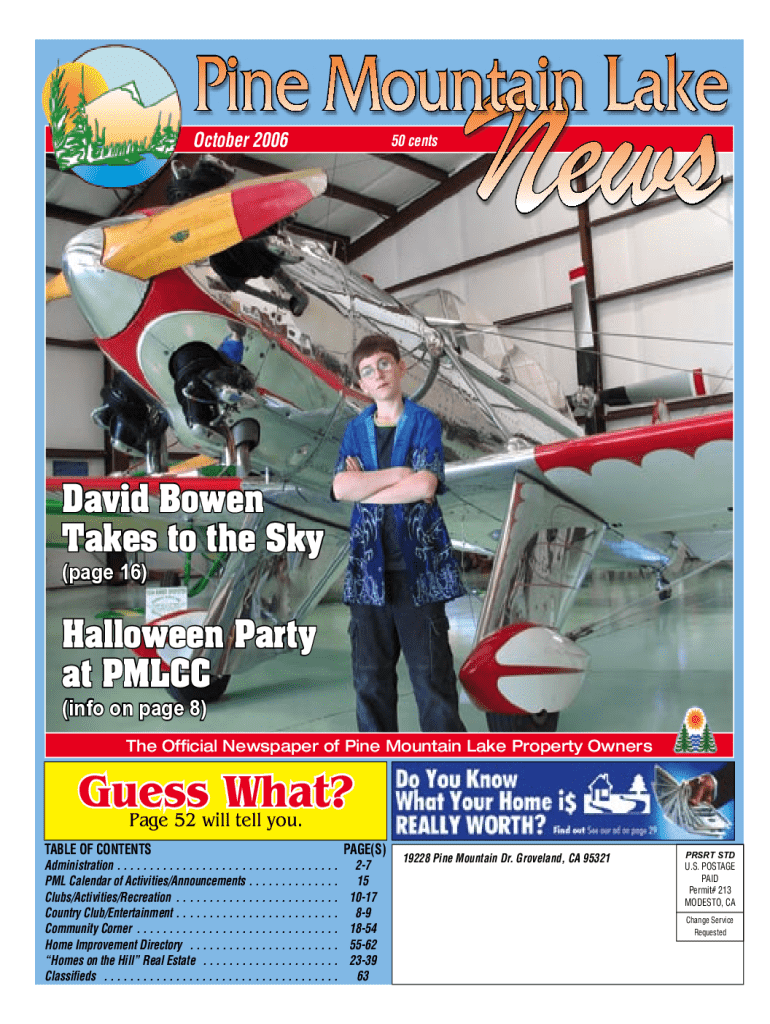 Pine Mountain LakeOctober 200650 centsNewsDavid Bowen Takes to the Sky (page 16)Halloween Party at PMLCC (info on page 8) The Official Newspaper of Pine Mountain Lake Property OwnersGuess What? Page