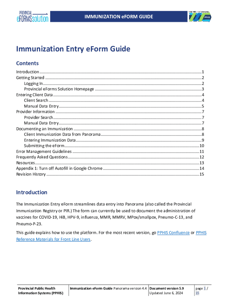 IMMUNIZATION eFORM GUIDESImmunization Entry eForm Guide Contents Introduction ...............................................................................................................................................