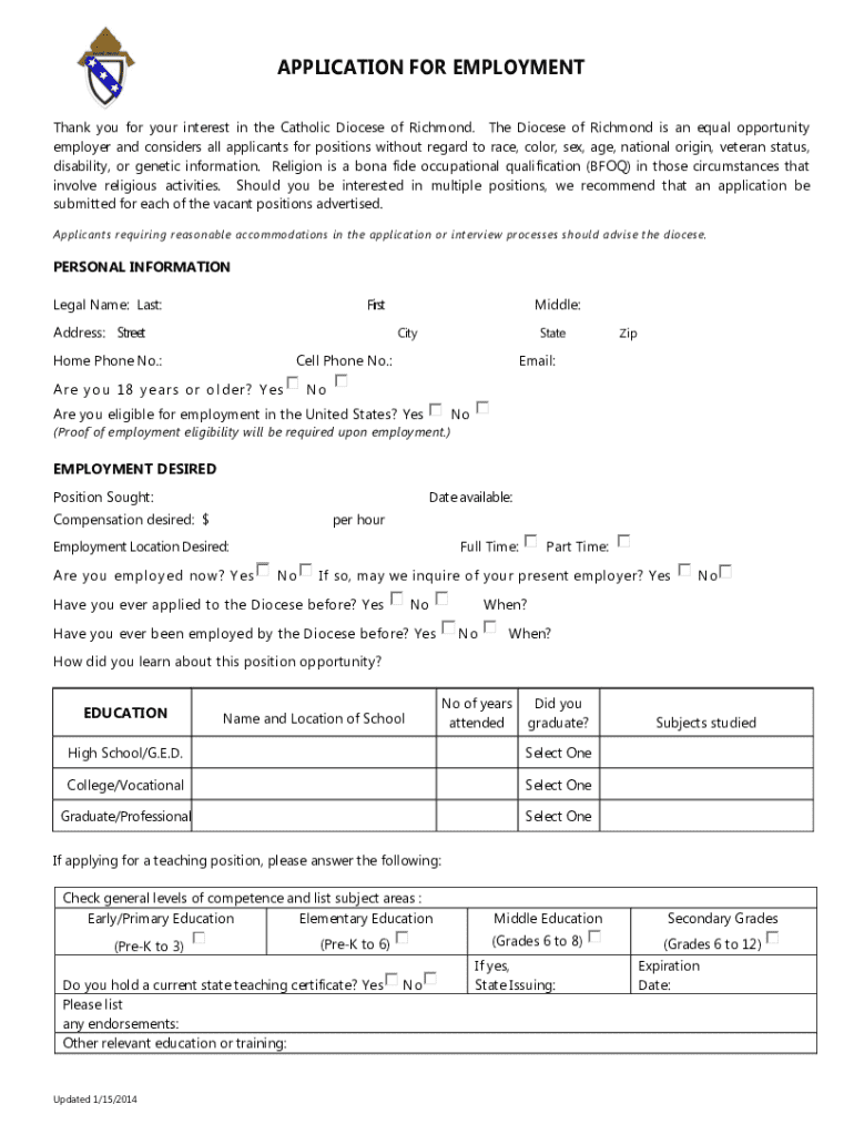 APPLICATION FOR EMPLOYMENT Thank you for your interest in the Catholic Diocese of Richmond. The Diocese of Richmond is an equal opportunity employer and considers all applicants for positions without