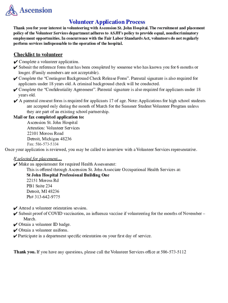 Volunteer Application ProcessThank you for your interest in volunteering with Ascension St. John Hospital. The recruitment and placement policy of the Volunteer Services department adheres to ASJHs