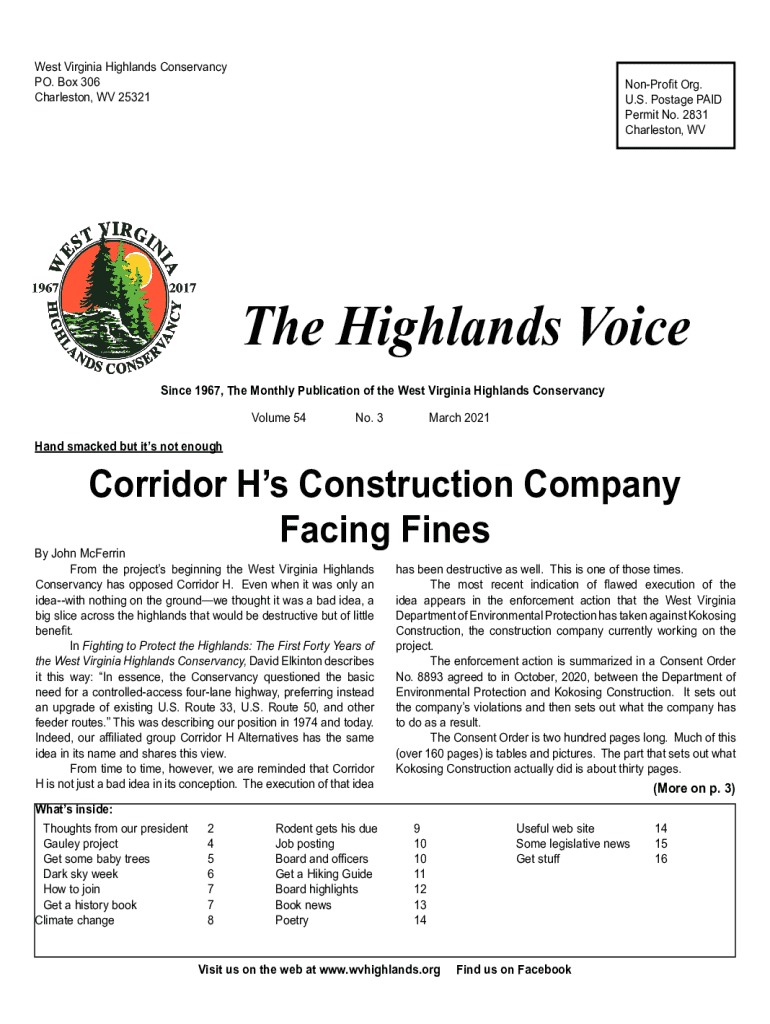 West Virginia Highlands Conservancy PO. Box 306 Charleston, WV 25321NonProfit Org. U.S. Postage PAID Permit No. 2831 Charleston, WVThe Highlands Voice Since 1967, The Monthly Publication of the West