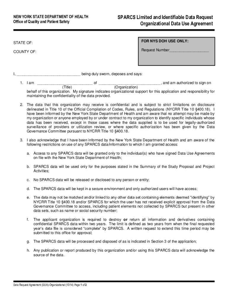 Get the free SPARCS Limited and Identifiable Data Request, Organizational Data Use Agreement, DOH...