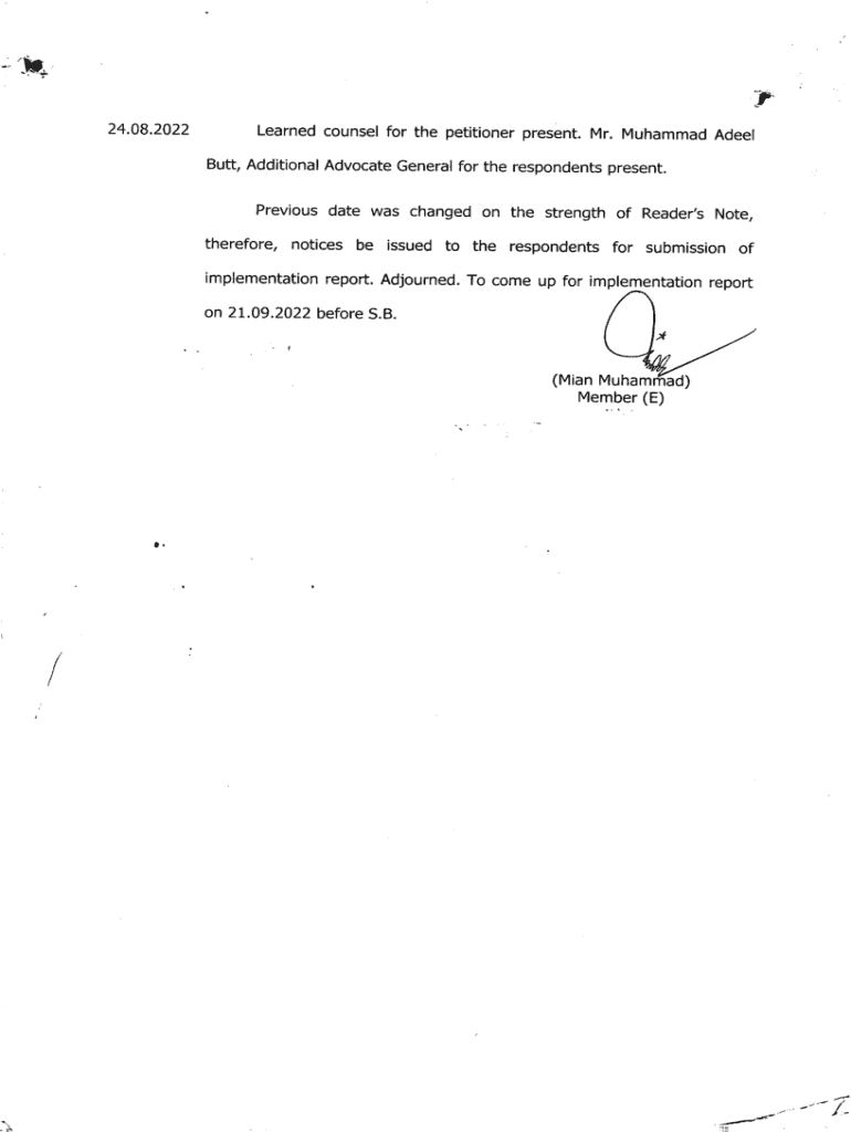 T 24.08.2022Learned counsel for the petitioner present. Mr. Muhammad Adeel Butt, Additional Advocate General for the respondents present. Previous date was changed on the strength of Reader\'s Note,
