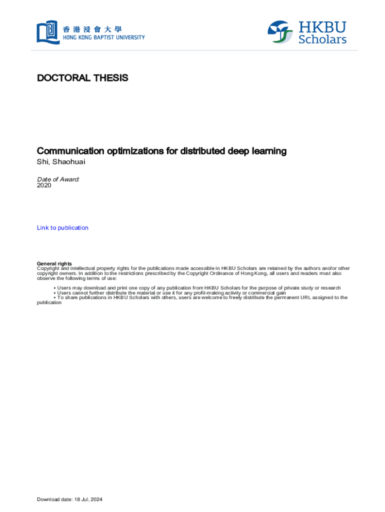 Hong Kong Baptist UniversityDOCTORAL THESISCommunication optimizations for distributed deep learning Shi, Shaohuai Date of Award: 2020Link to publicationGeneral rights Copyright and intellectual property