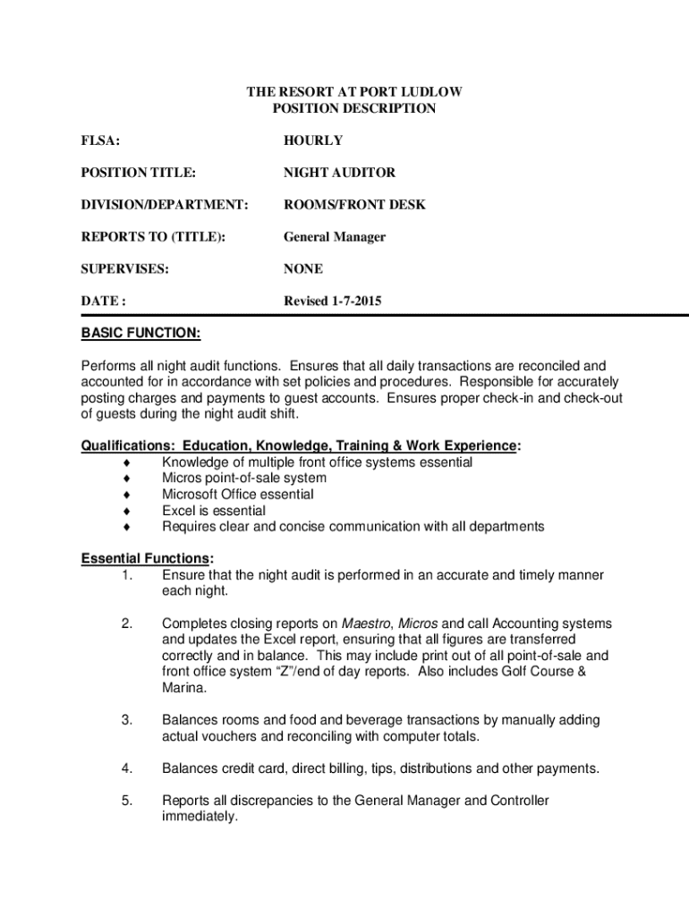 FLEA:HOURLYPOSITION TITLE:NIGHT AUDITORDIVISION/DEPARTMENT:ROOMS/FRONT MISREPORTS TO (TITLE):General ManagerSUPERVISES:OPERATE :Revised 172015BASIC FUNCTION: